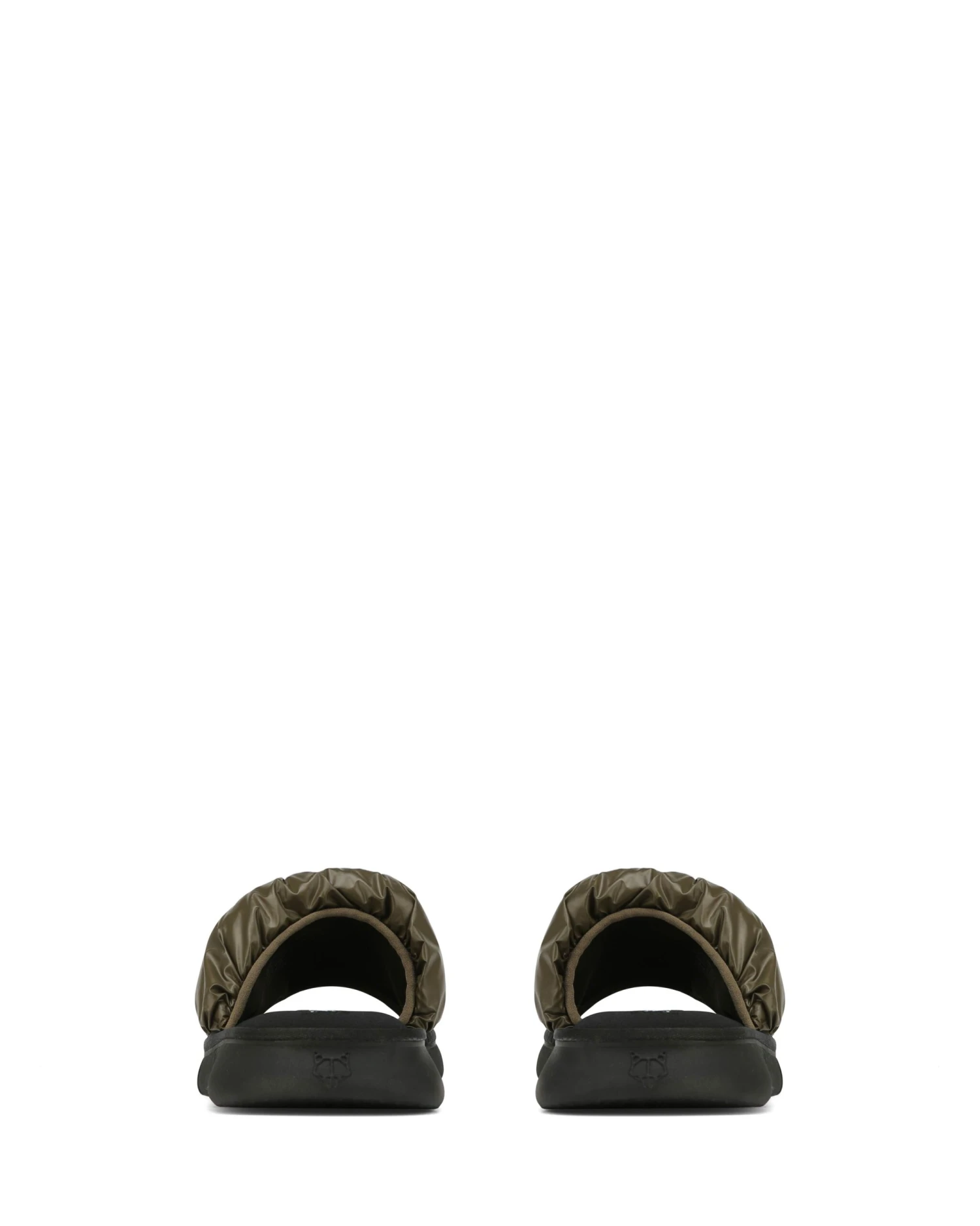 Coasting the open toe puffer slide made with nylon lining and waterproof nylon upper featuring the famous Wolfe Head logo on the toe.