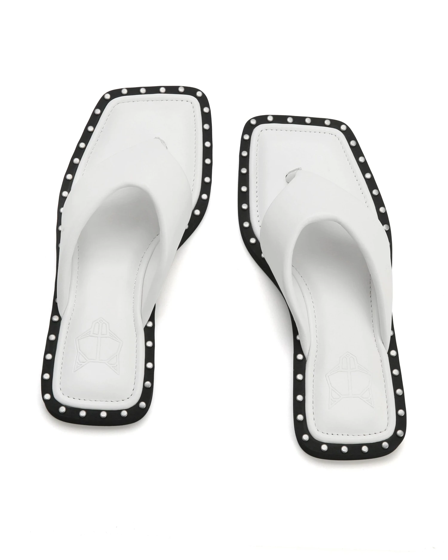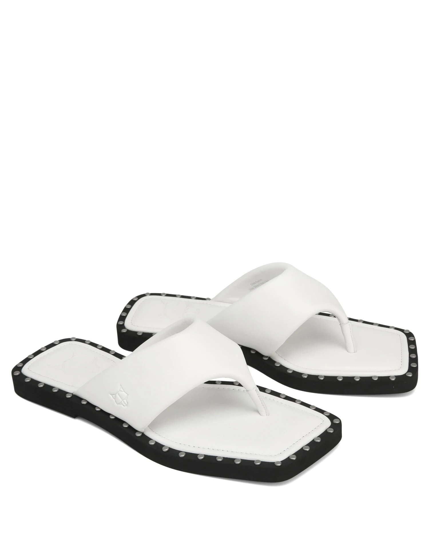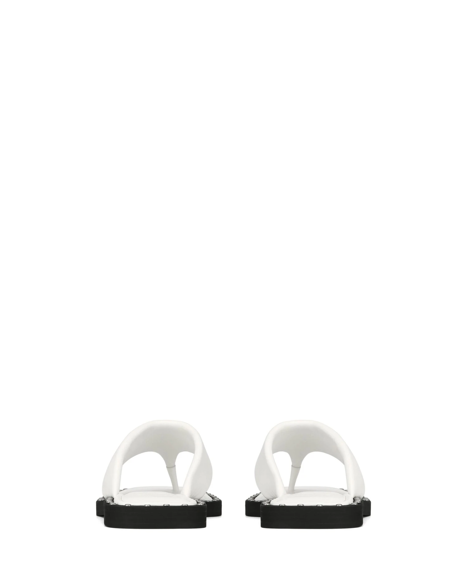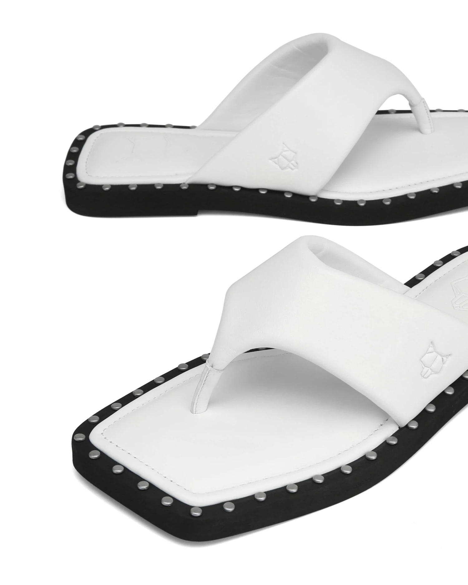 Danni is a padded thong. Danni’s sole is made from high quality lightweight resin, featuring flat lay circular studs which outline the shape of the NW designed, square-toe sole. Danni’s thong upper is 100% leather and is made from only the softest padding. Danni has a soft leather padded sock, providing maximum comfort. Featuring pillow embossed wolfe heads on both upper and sock.