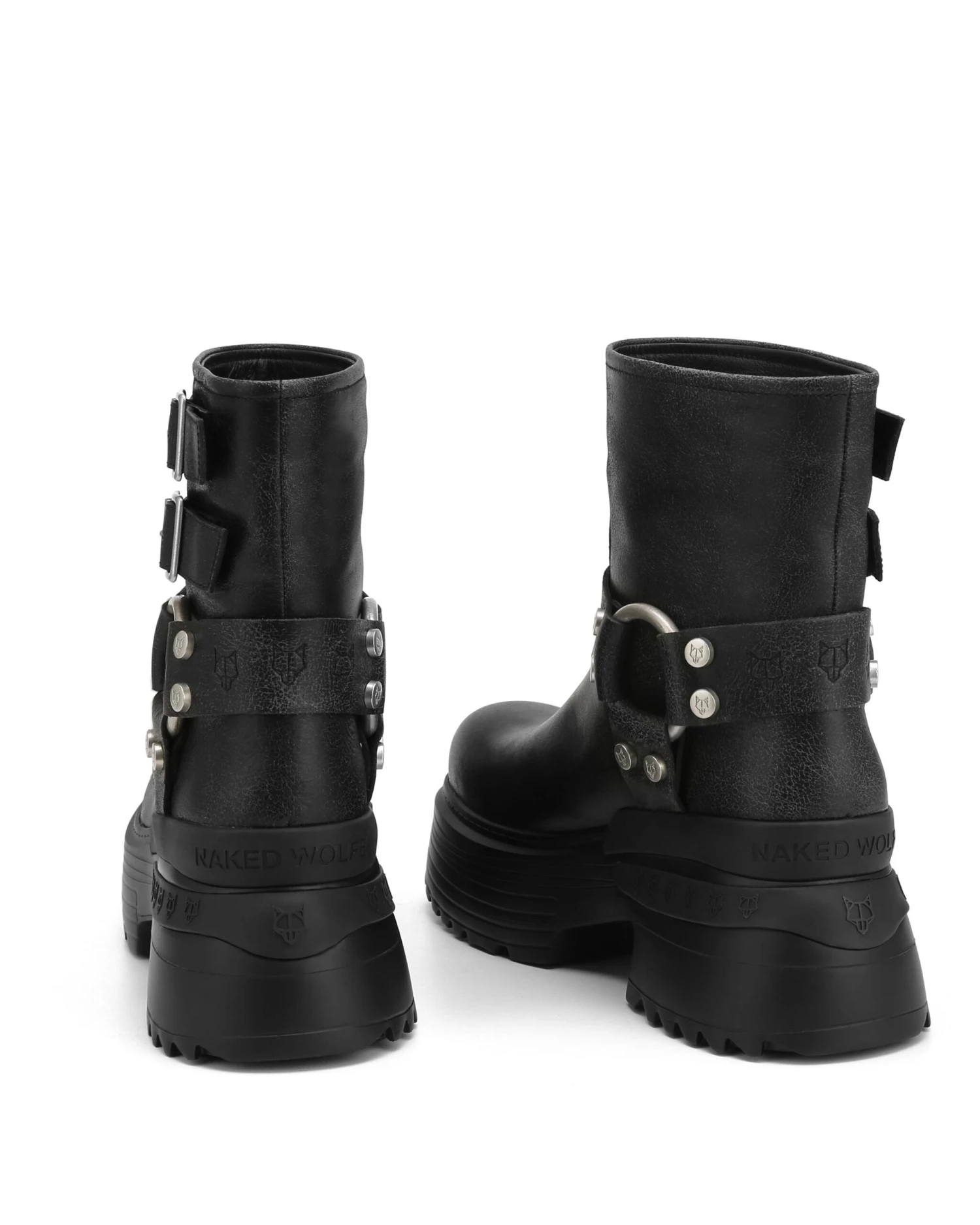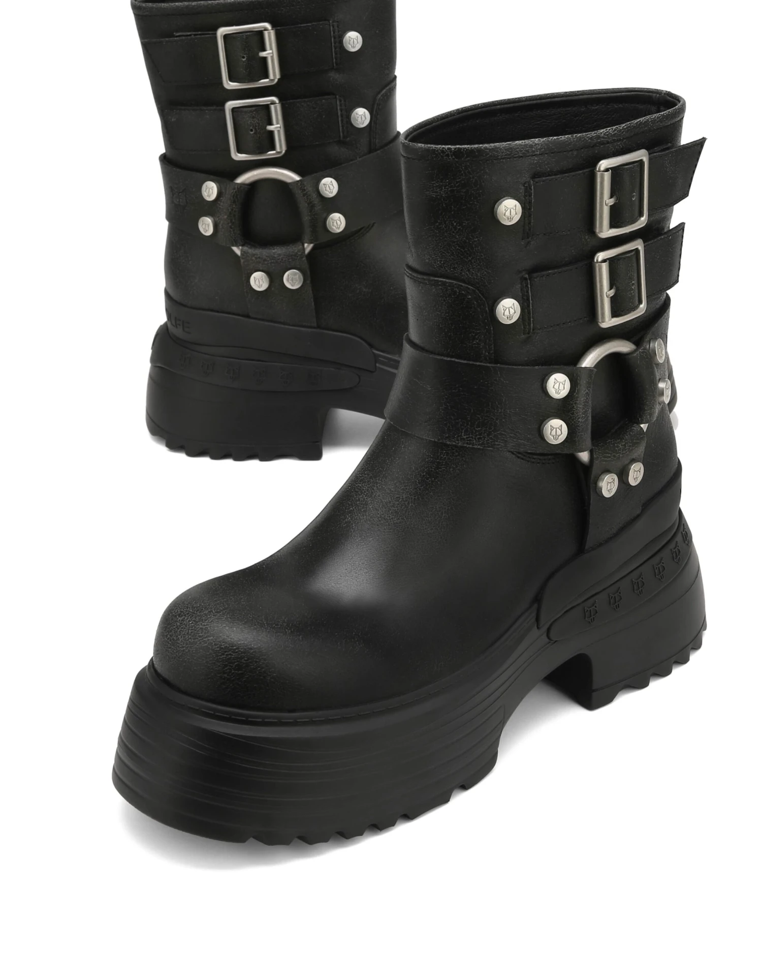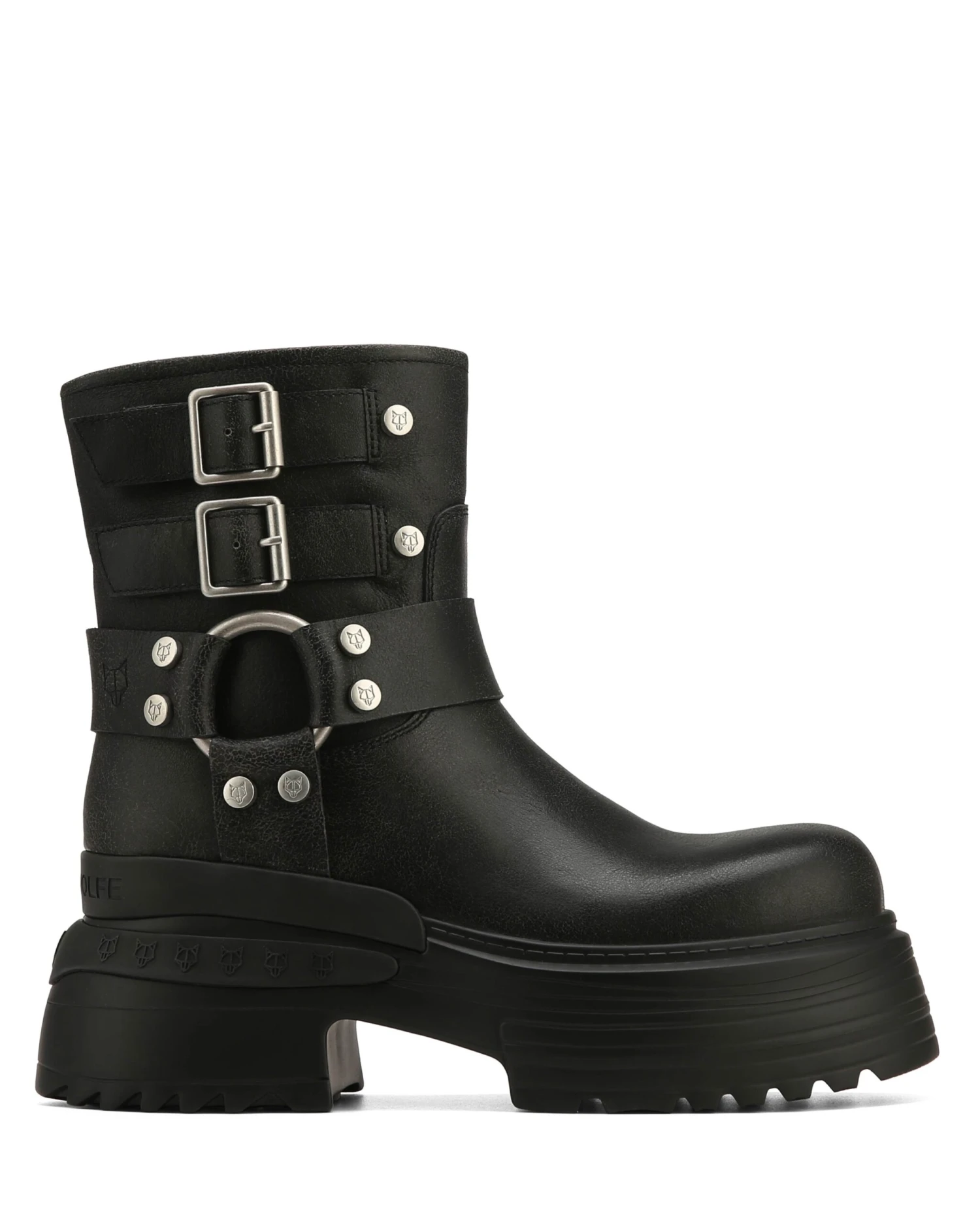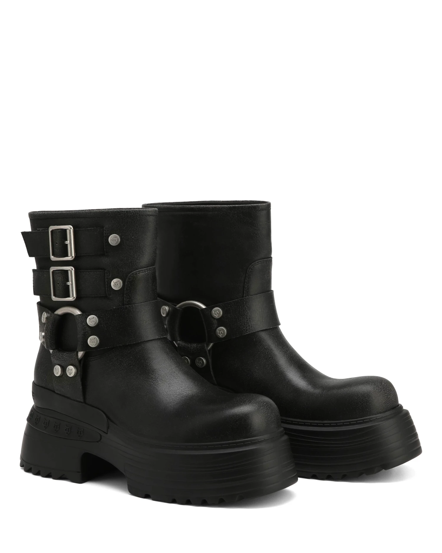 Eclipse our new tiny little ankle boot. This boot is designed with a multiple buckle strap upper detail, Western ring harness, Branded studs, Stone wash/suede leather duo.