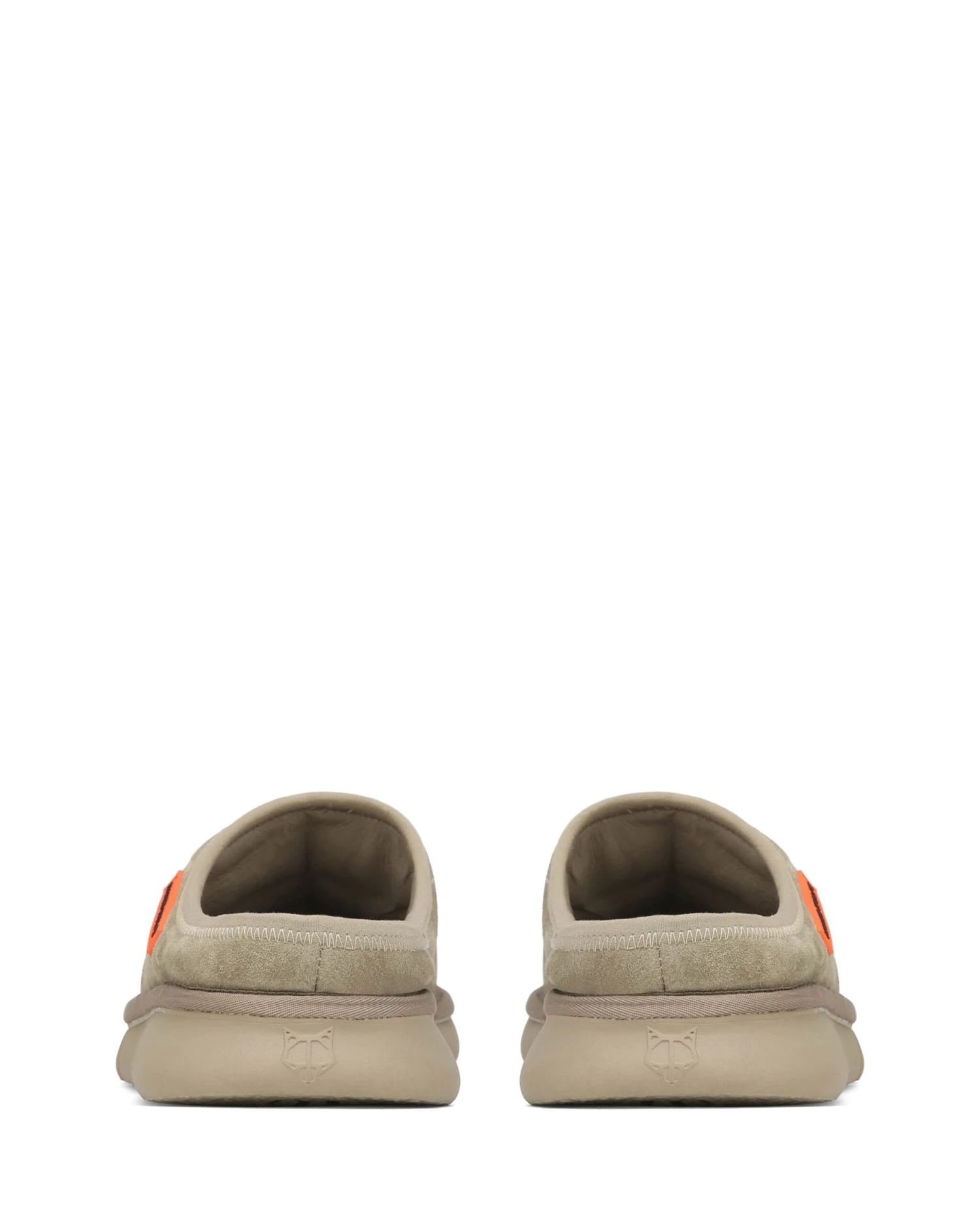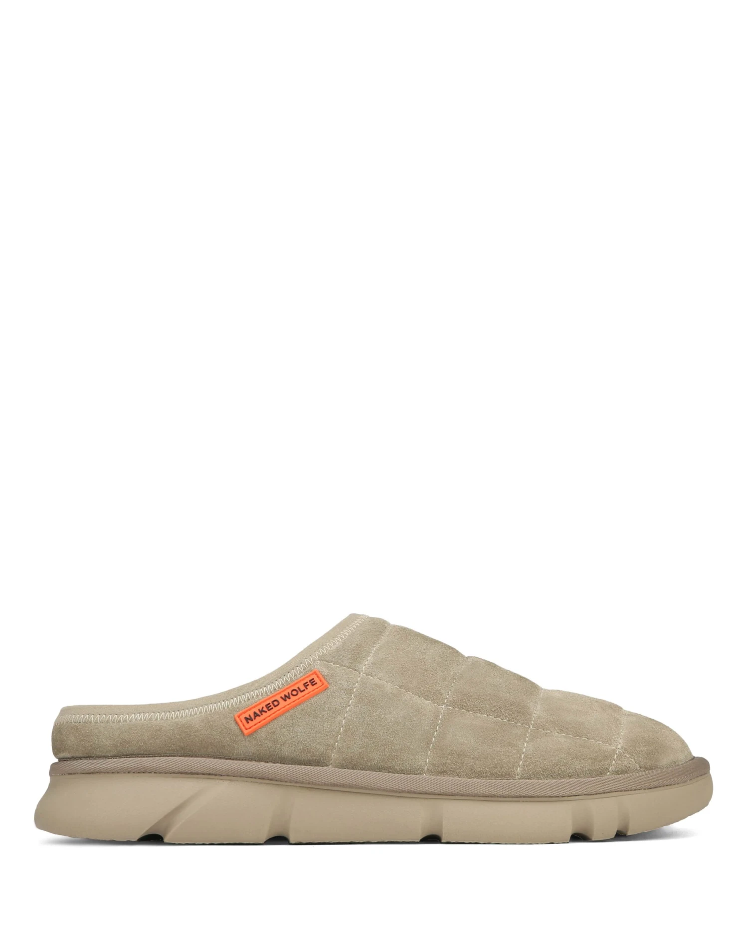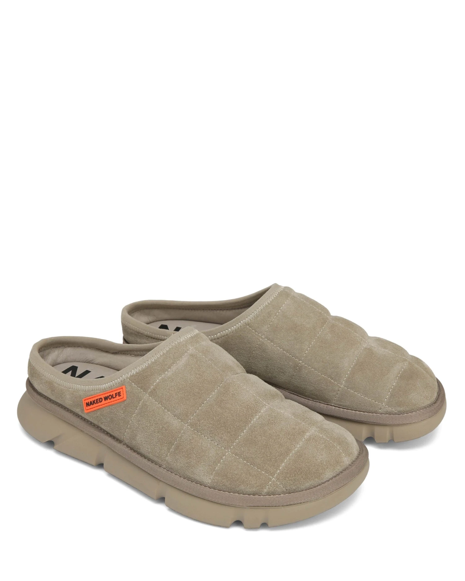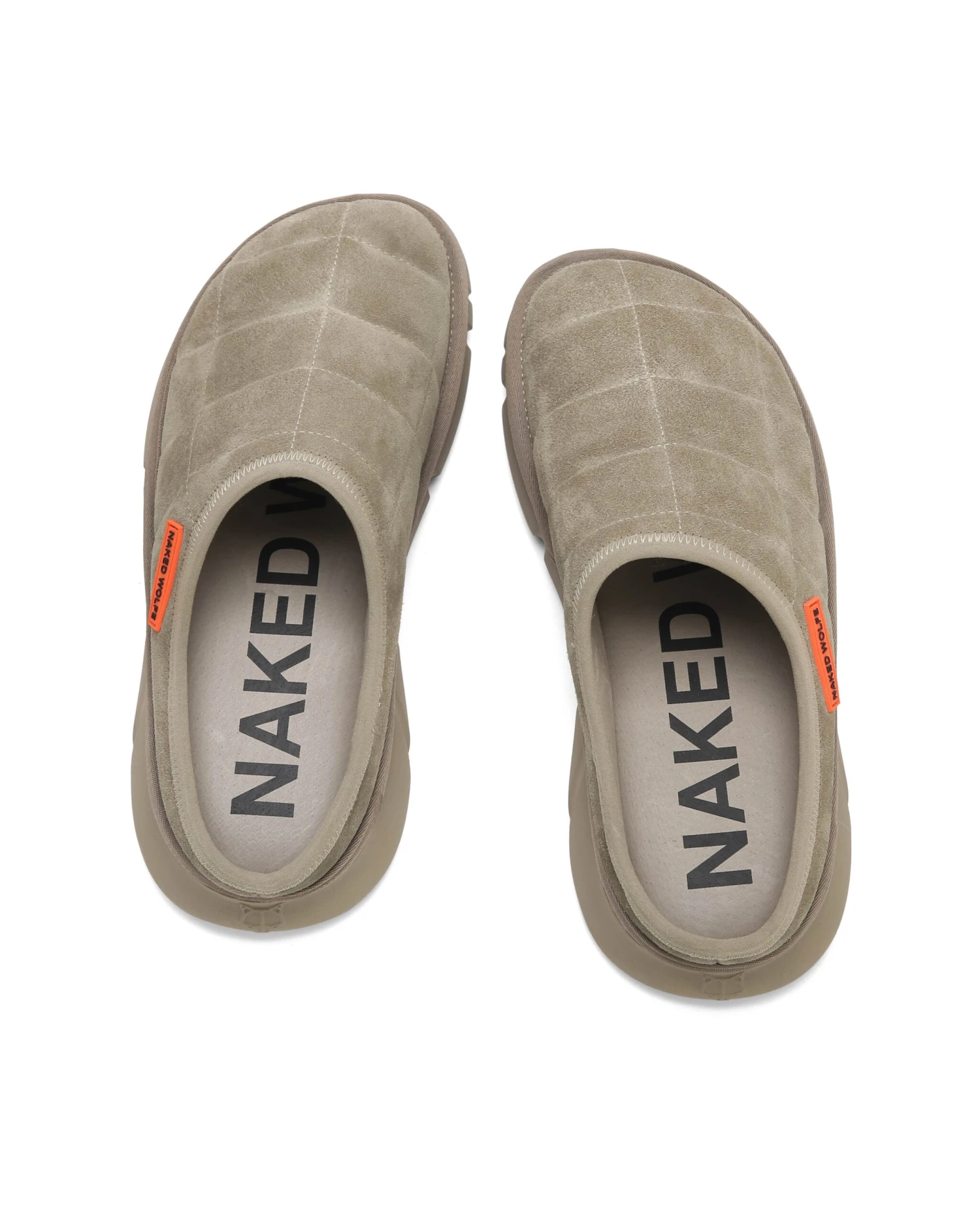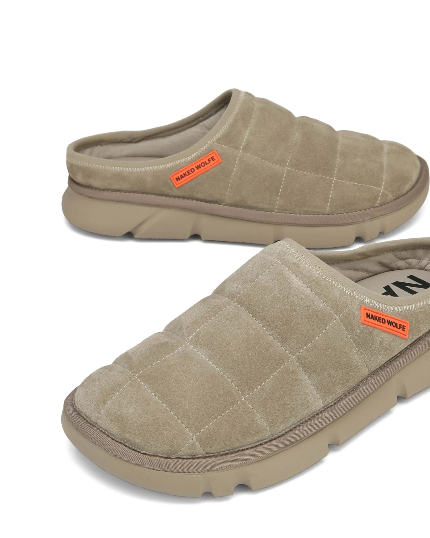 Montana, the closed toe puffer slide made with leather lining and suede upper – featuring new rubber side logo.Â
