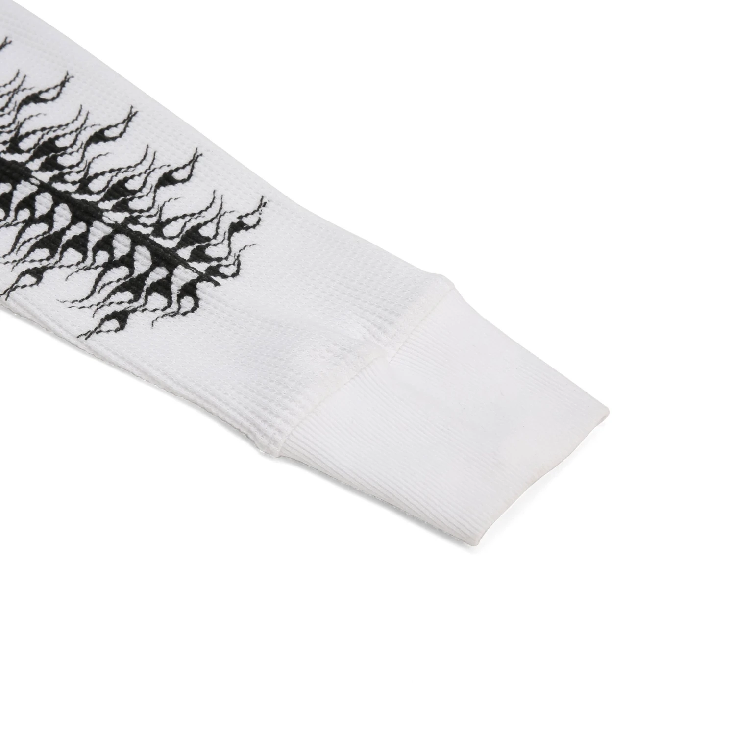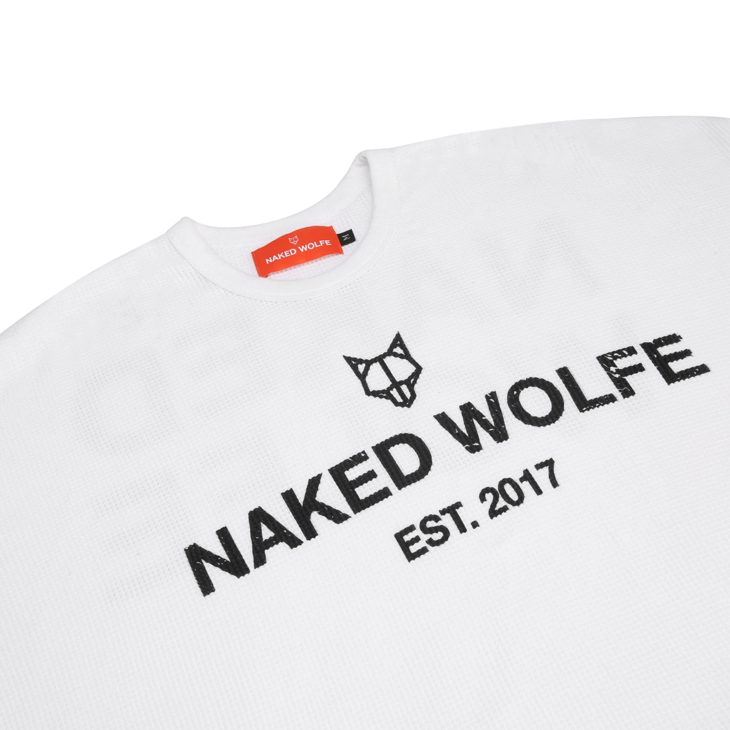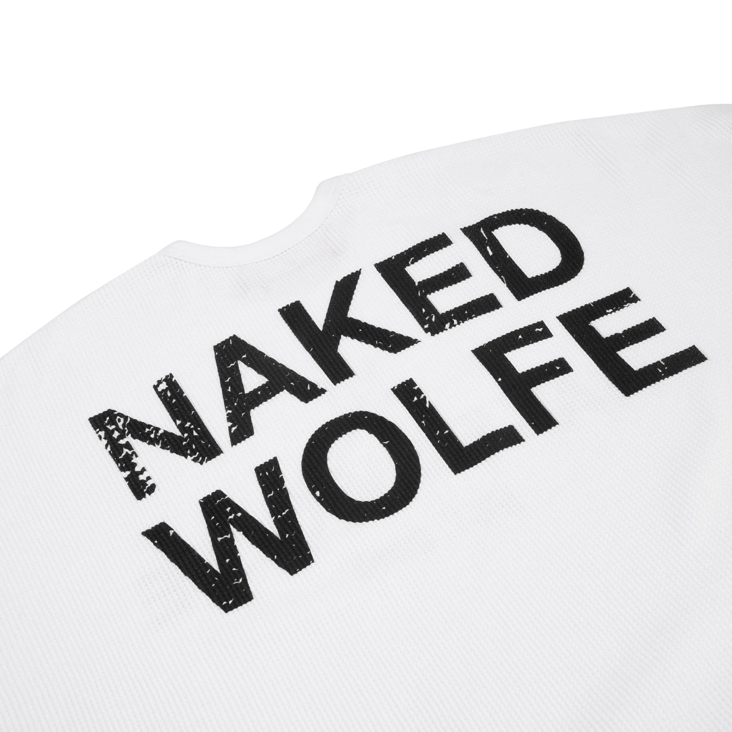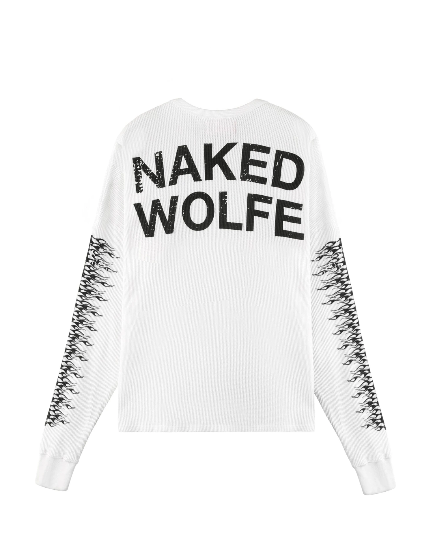 A part of our debut AW collection is the Naked Wolfe Thermal long sleeve T-shirt. We reimagined a classic underlay from the 90’s and made it current. With a thicker collar and softer waffle cotton we have made the perfect long sleeve for A/W. With Screen printed heritage logos and flames up the arms, this is the creative director’s favorite piece.