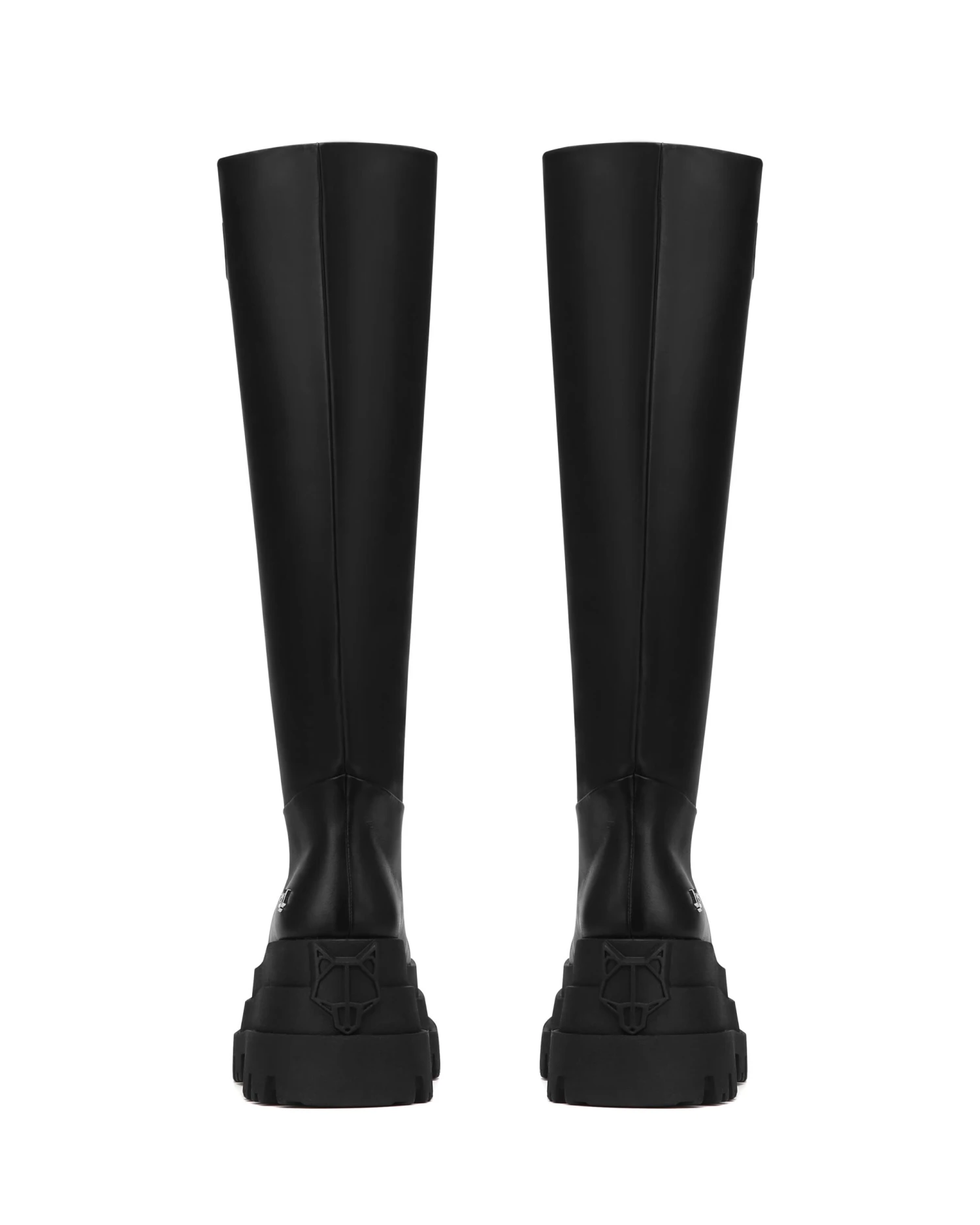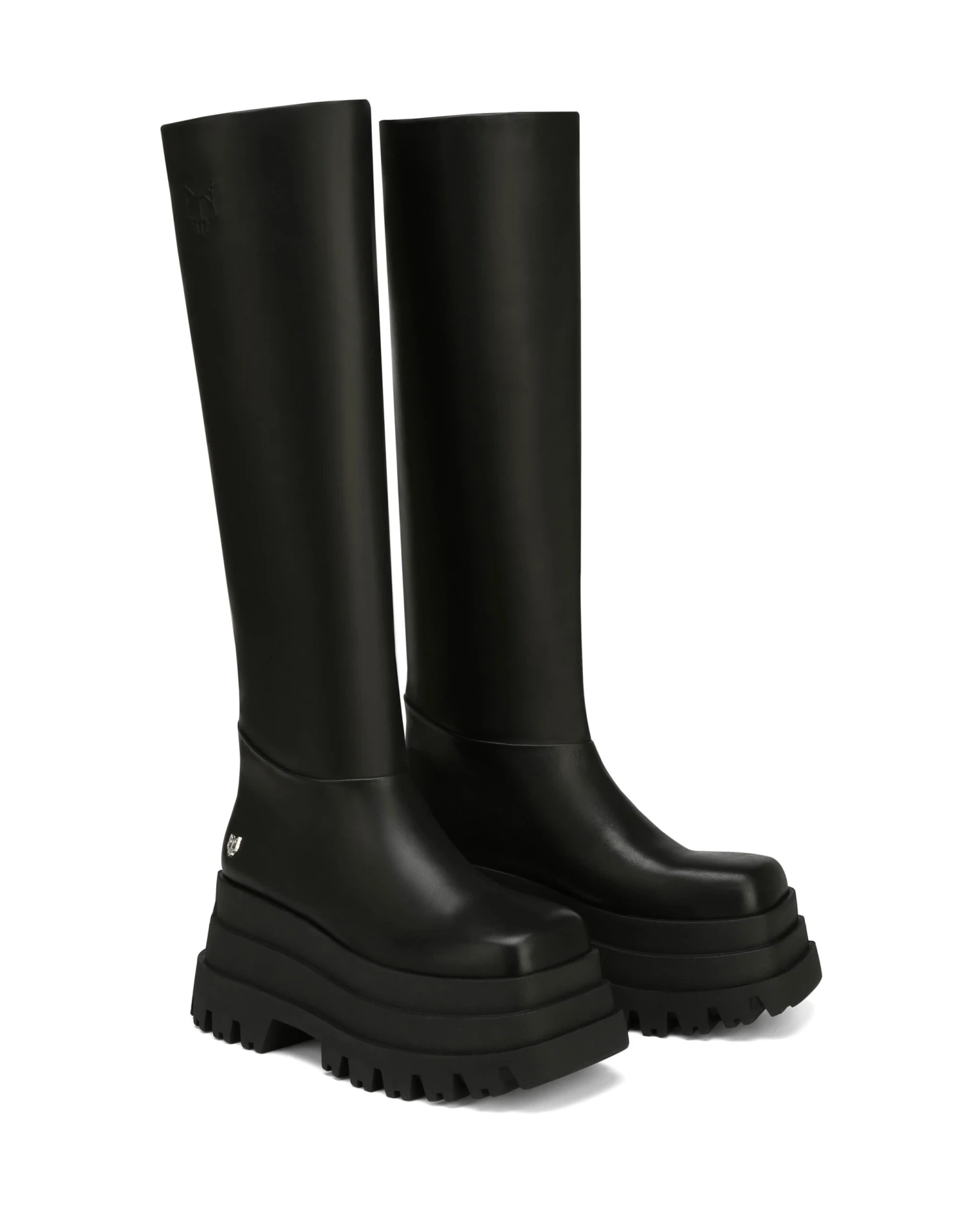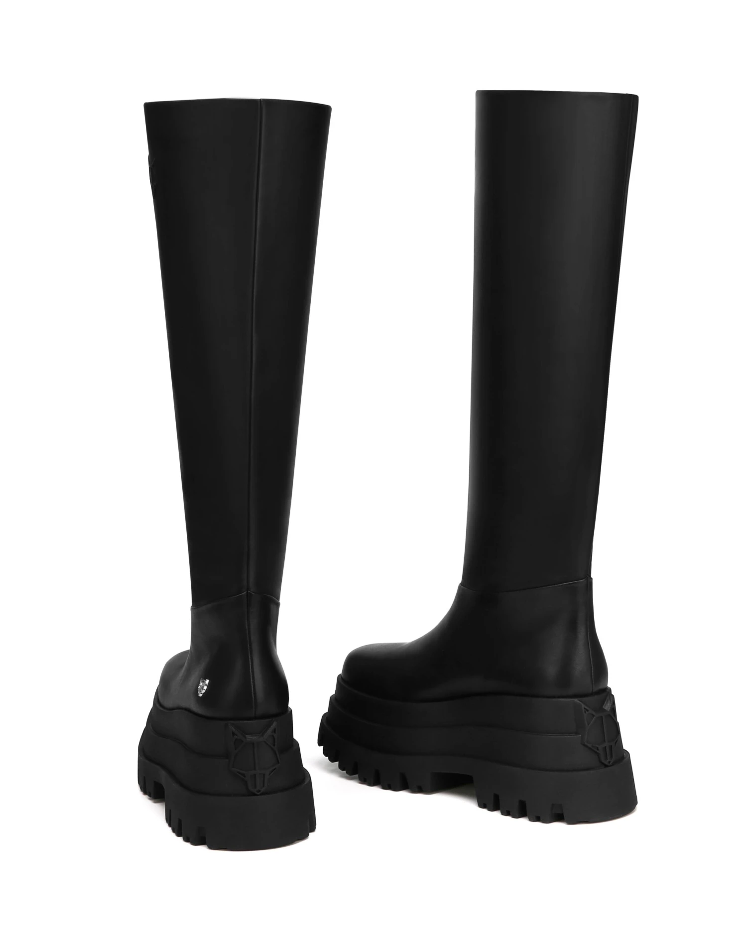 Sasha, our brand new A/W 22 over the knee straight leg leather boot has arrived. Featuring a Custom Naked Wolfe designed 3 tier outsole with a Wolfe Head logo embedded in the heel and Square toe detail.