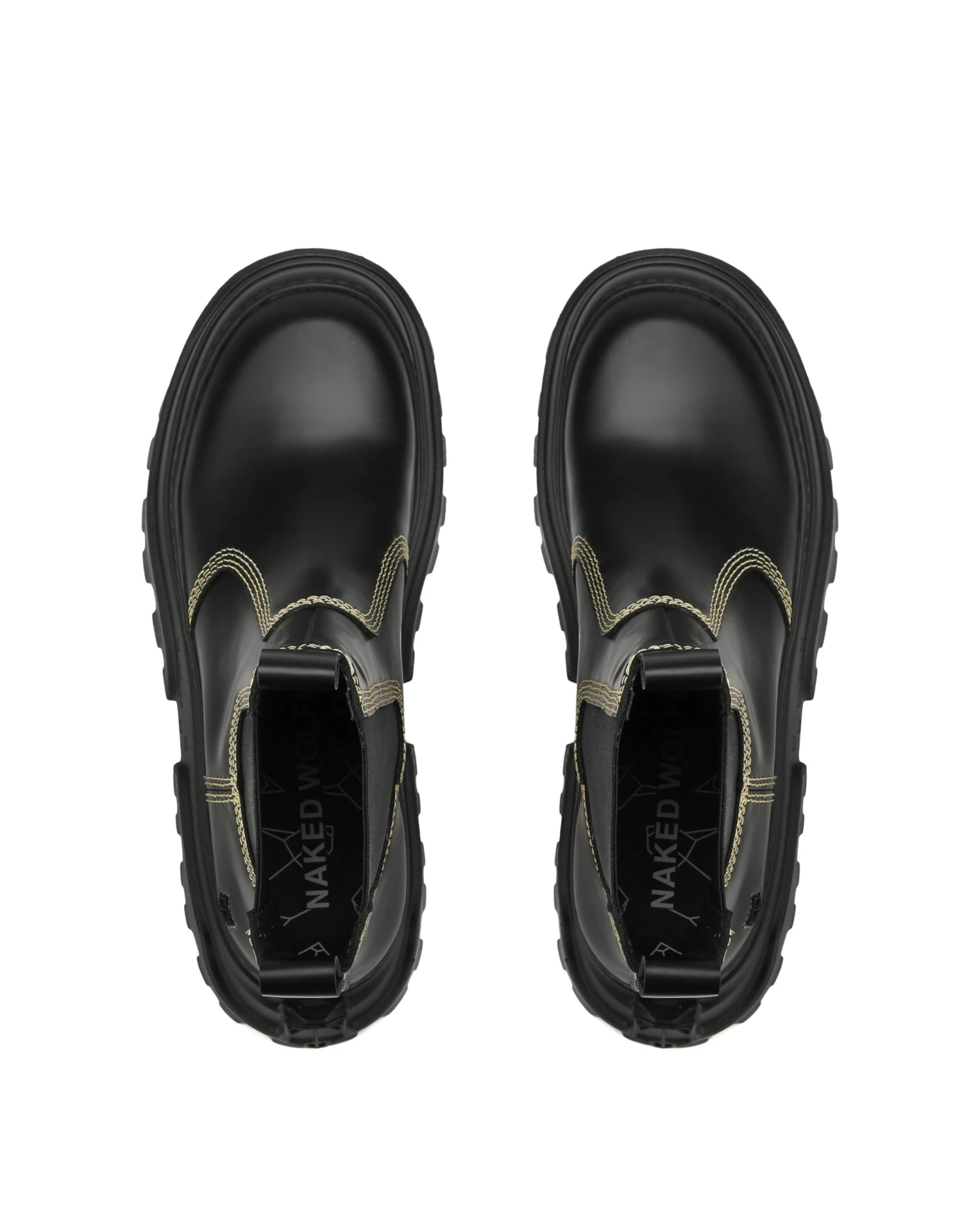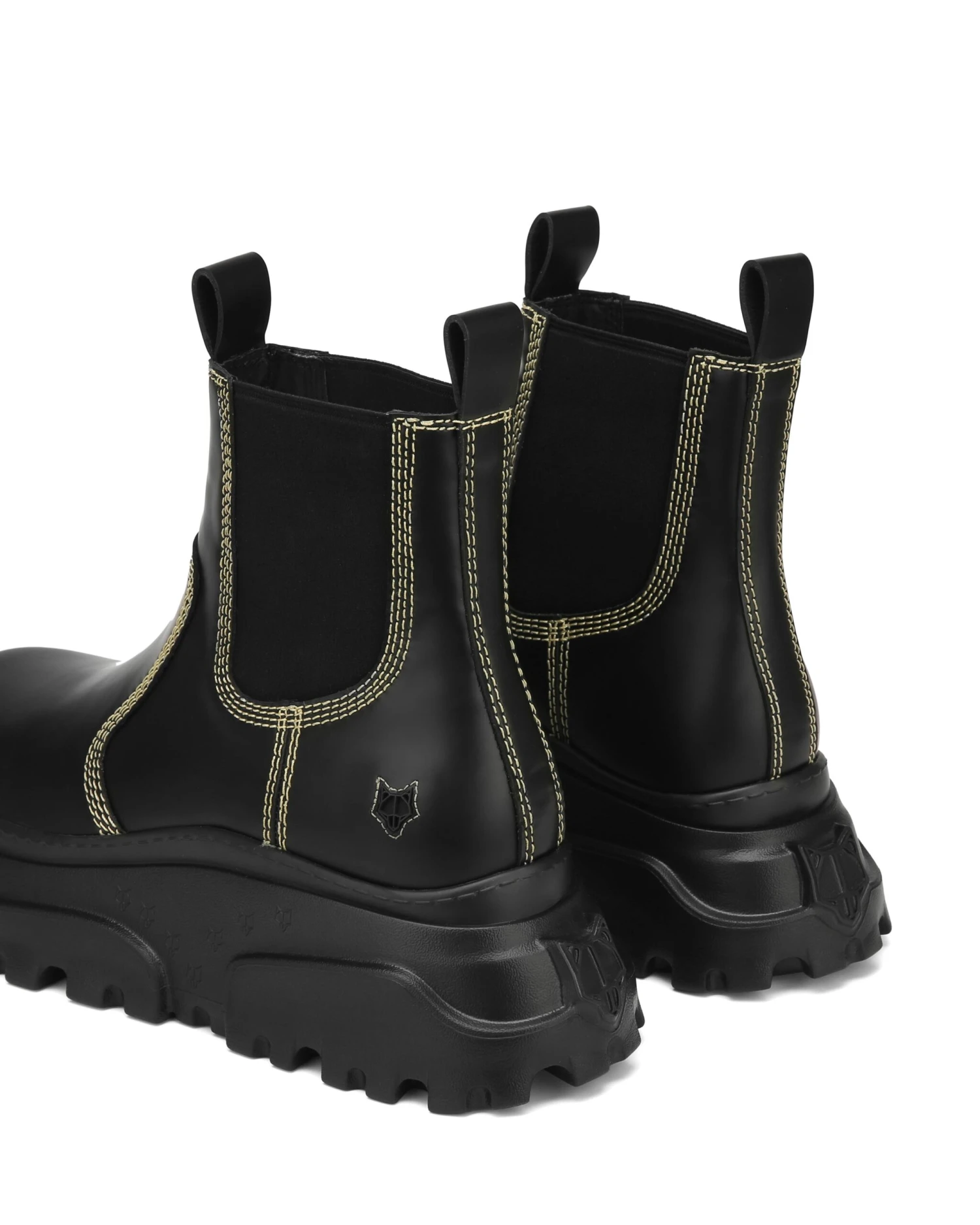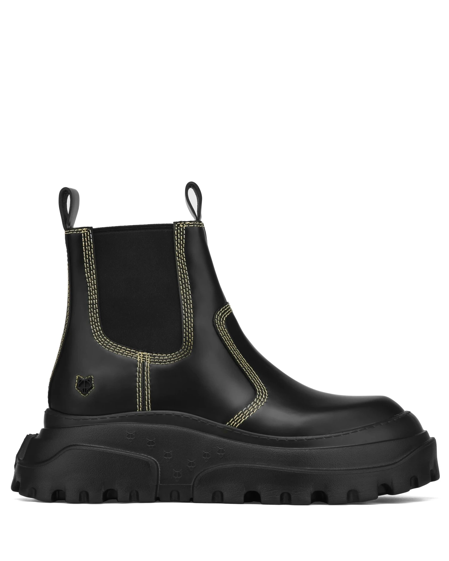 Introducing Sour – our modern take on the classic Chelsea boot and apart of our FW 22 collection. With a box leather upper, yellow contrast stitching, and double sided elastic gussets for strength – this pull up style boot was designed for ware. Featured on our Naked Wolfe 2- tier outsole with custom black rubber Wolfe head detail on back counter.