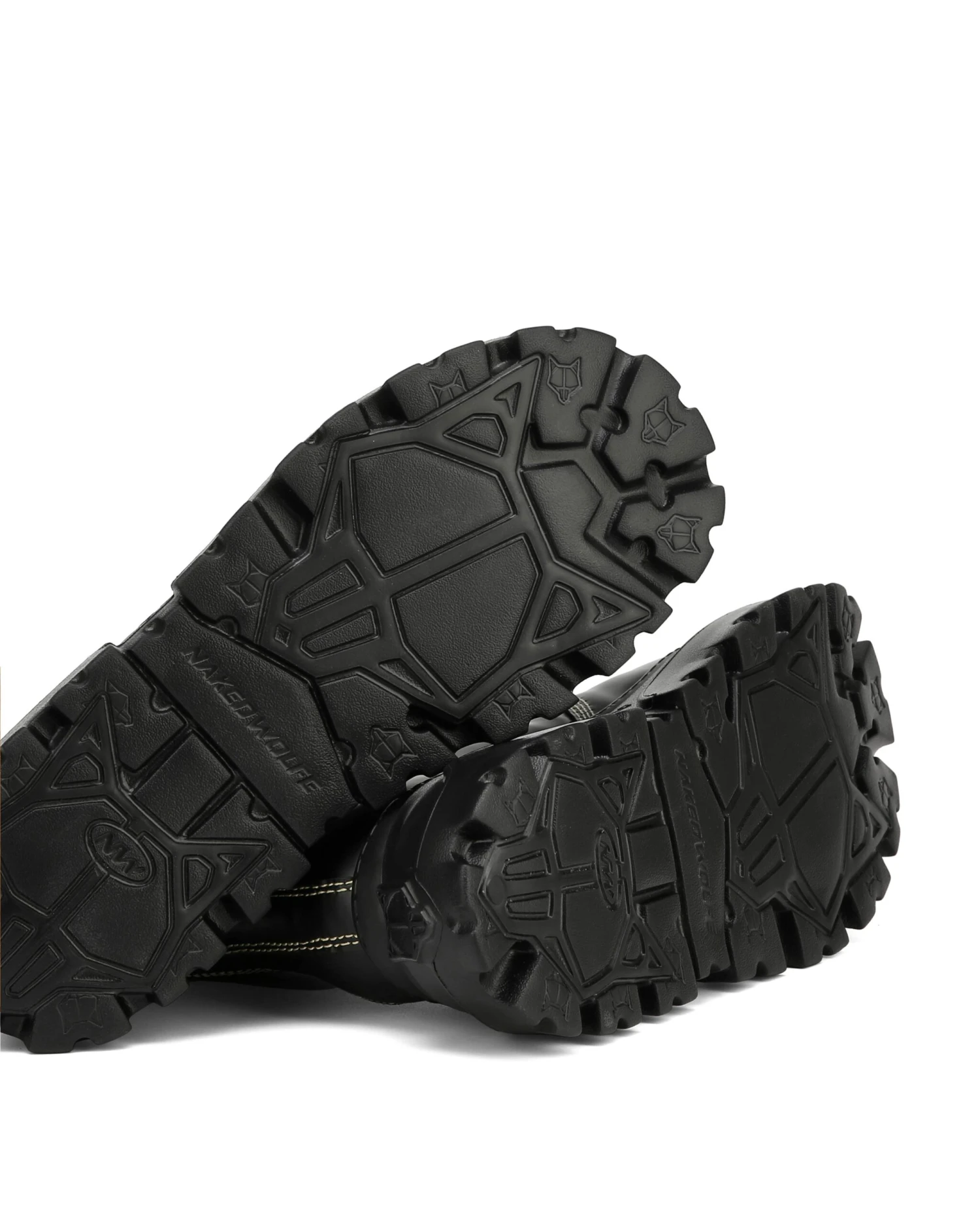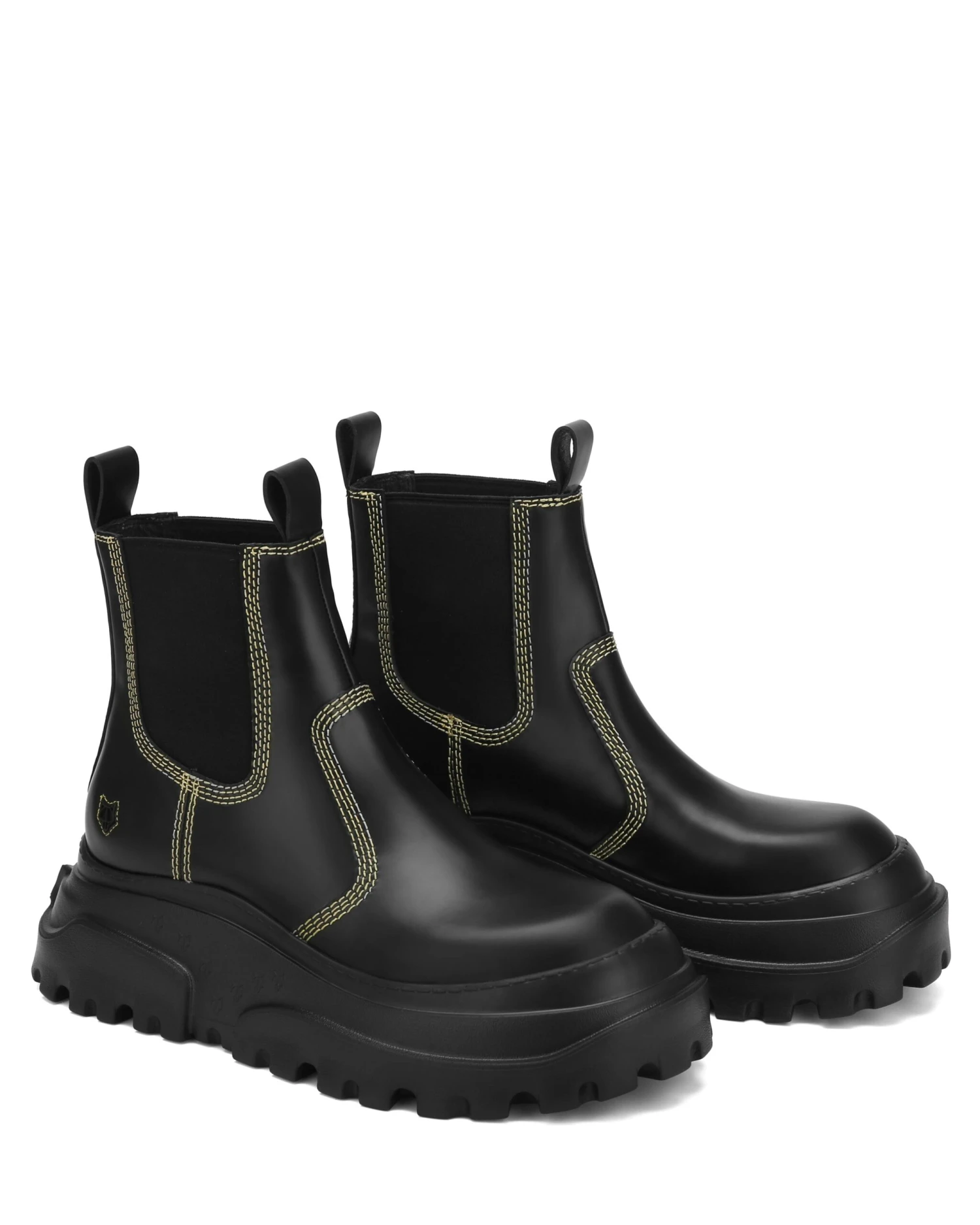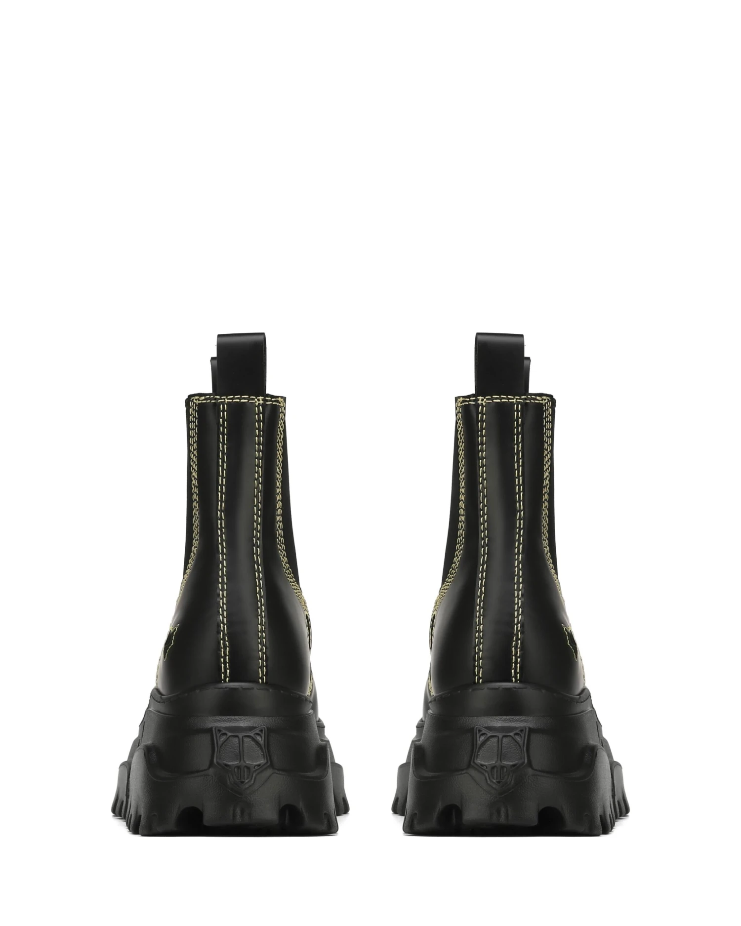 Introducing Sour – our modern take on the classic Chelsea boot and apart of our FW 22 collection. With a box leather upper, yellow contrast stitching, and double sided elastic gussets for strength – this pull up style boot was designed for ware. Featured on our Naked Wolfe 2- tier outsole with custom black rubber Wolfe head detail on back counter.