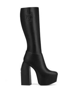 Sting is a statement platform boot. Sting rocks a squared toe last with our statement Naked Wolfe curved block heel, this iconic heel shape is recognisable at any party. Sting is a sexy below knee height boot with an inside leg zip, constructed from luxury leather featuring a hidden stretch PU panel making this perfect for all leg shapes. Sting features an debossed wolfe head.