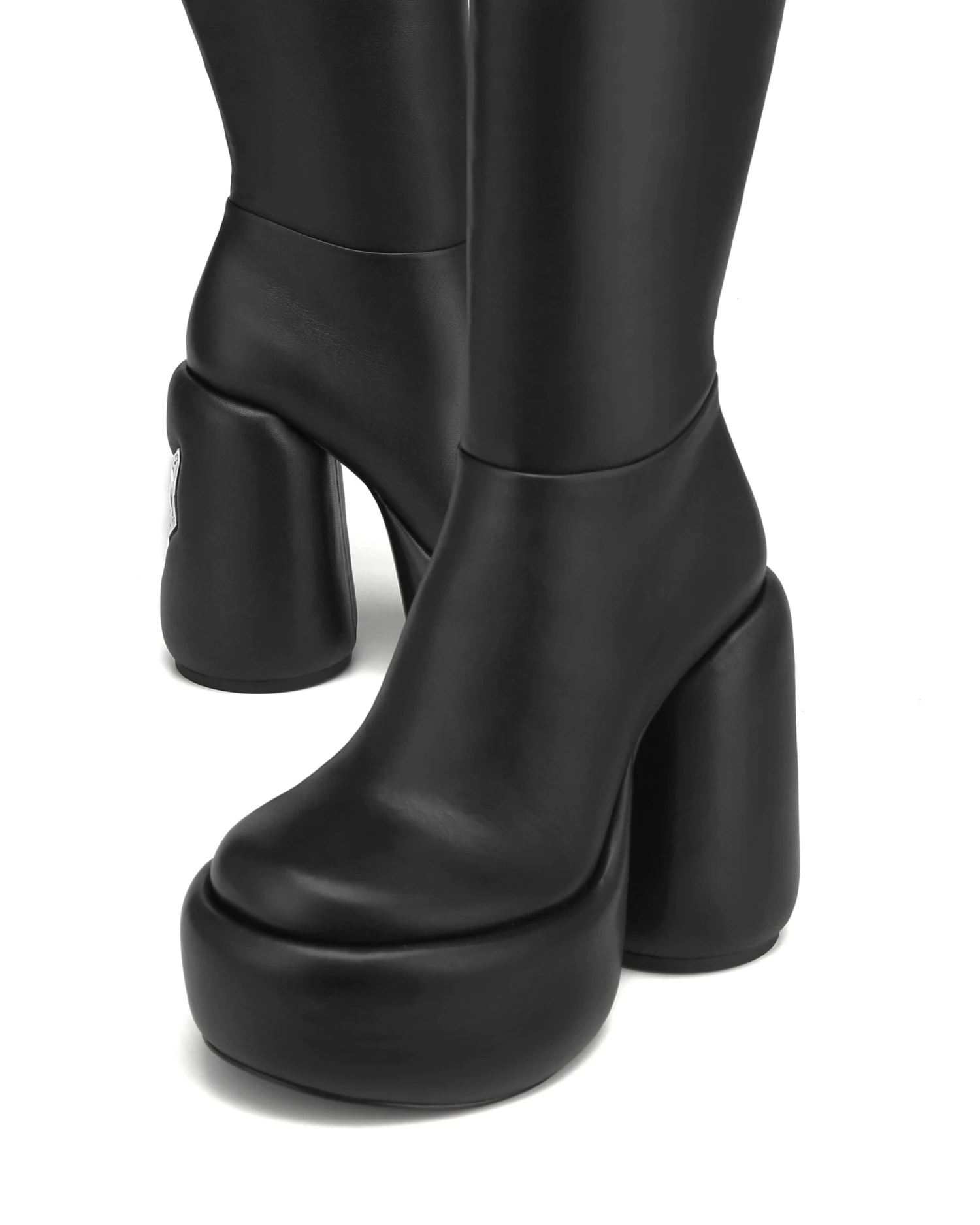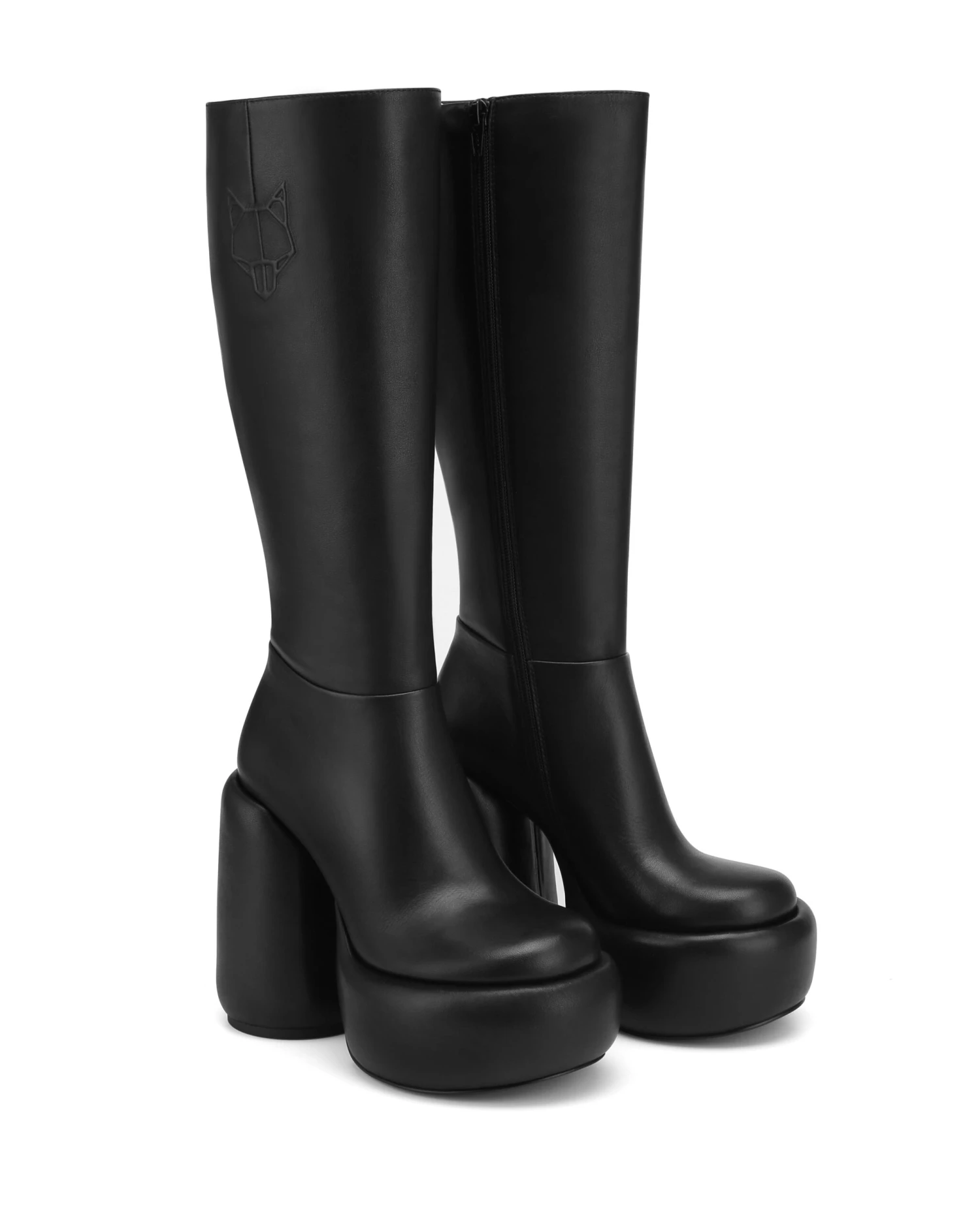 Wanted, the newest most desirable boot. Wanted is based on a show stopping exaggerated round toe shape. Made from the finest leather, this boot is not one to be missed. Wanted offers an inside leg zip and elasticated gore to fit your leg perfectly. Wanted features a padded platform and heel which embeds the iconic Naked Wolfe wolfe head plaque.